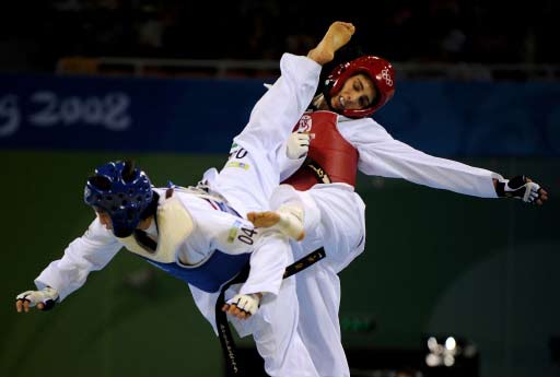 Sheikha Maitha Almaktoum (red) of United Arab Emirates fights with Hwang Kyungseon of South Korea in the women's -67 kg taekwondo preliminary match during the 2008 Beijing Olympic Games in Beijing on August 22, 2008.[Agencies]