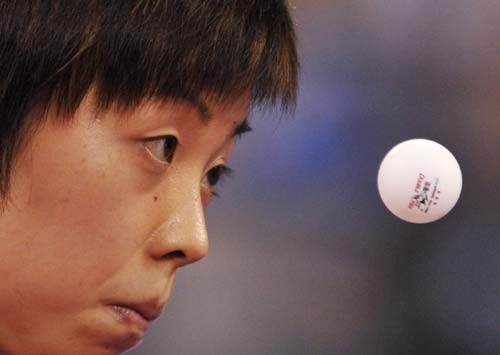 Zhang Yining of China eyes the ball during her women's singles gold medal table tennis match against Wang Nan of China at the Beijing 2008 Olympic Games August 22, 2008. [Agencies]