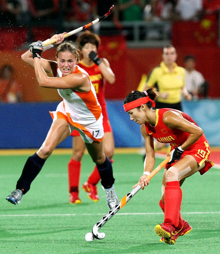 The Netherlands' Maartje Paumen (L) charges China's Chen Qiuqi (R) in their women's final field hockey match during the 2008 Beijing Olympic Games at the Olympic Green Hockey Stadium on August 22, 2008. [Agencies]