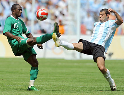 Argentinian midfielder Angel Di Maria (R) fights for the ball with Nigerian midfielder Promise Isaac during the men's Olympic football final Argentina vs. Nigeria at the national stadium in Beijing during the 2008 Beijing Olympic games on August 23, 2008. Argentina leads 1-0. [Agencies]