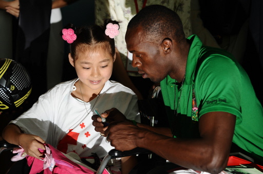 Olympic champion Usain Bolt meets Sichuan kids