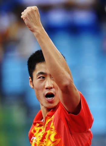 Wang Liqin of China celebrates after winning his men's singles bronze medal table tennis match against Jorgen Persson of Sweden at the Beijing 2008 Olympic Games August 23, 2008.[ Agencies]