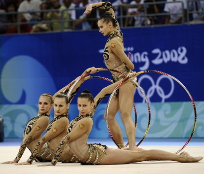 The team of Russia competes in the group all-around qualification of the rhythmic gymnastics at the Beijing 2008 Olympic Games in Beijing on August 22, 2008. [Agencies]