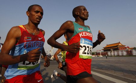 Yonas Kifle from Eritrea and Samuel Kamau Wanisuru from Kenya (R) run in front of the Tiananmen Gate after the start of the men's marathon at the Beijing 2008 Olympic Games, August 24, 2008. [Agencies]