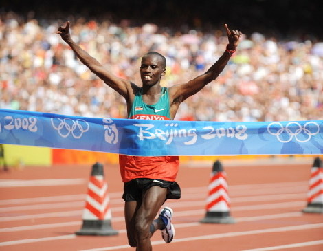 Kenya's Samuel Kamau Wansiru crosses the finishline in the men's marathon at the "Bird's Nest" National Stadium during the 2008 Beijing Olympic Games on August 24, 2008. Wansiru won the men's marathon title, giving Kenya their first ever Olympic gold in the event. The 21-year-old timed 2hr 06:32, breaking the 24-year-old Olympic record set by Carlos Lopes. Morocco's Jaouad Gharib (2hr 07:16) took silver and Ethiopia's Tsegay Kebede of Ethiopia the bronze (2hr 10:00). [Agencies]