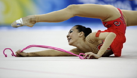 A member of the the team of China competes in the group all-around final of the rhythmic gymnastics at the Beijing 2008 Olympic Games in Beijing on August 24, 2008. [Agencies]