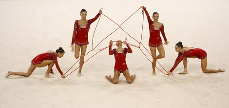 Bulgaria perform during the group all-around final of the rhythmic gymnastics competition at the Beijing 2008 Olympic Games August 24, 2008. [Agencies]