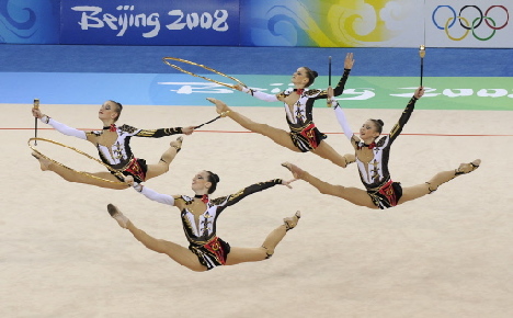 The team of Ukraine competes in the group all-around final of the rhythmic gymnastics at the Beijing 2008 Olympic Games in Beijing on August 24, 2008. [Agencies]