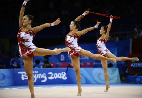 The team of Azerbaijan competes in the group all-around final of the rhythmic gymnastics at the Beijing 2008 Olympic Games in Beijing on August 24, 2008. [Agencies]