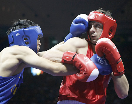 Zhang Xiaoping (L) of China fights Kenny Egan of Ireland during their light heavyweight (81kg) finalboxingmatch at the Beijing 2008 Olympic Games, August 24, 2008. [Agencies]