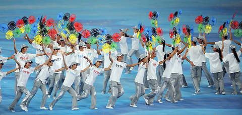 Performers celebrate the closing ceremony of 2008 Beijing Olympic Games in the National Stadium also know as the "Bird's Nest". [Xinhua]