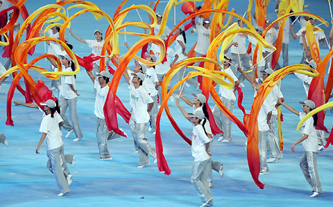 Dancers perform to celebrate the closing ceremony of 2008 Beijing Olympic Games at the National Stadium also know as the "Bird's Nest" on August 24, 2008. [Xinhua]