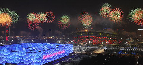 Fireworks light up the sky of the National Stadium, also known as the Bird's nest, at the start of the closing ceremony of the 2008 Beijing Olympic Games in Beijing on August 24, 2008. [Agencies]