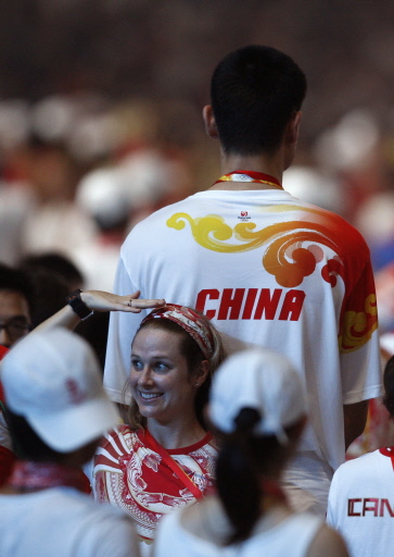 Chinese basketball star Yao Ming stands among other athletes during the closing ceremony for the 2008 Beijing Olympic Games at the National Stadium, also known as the "Bird's Nest" on August 24, 2008.[Agencies]