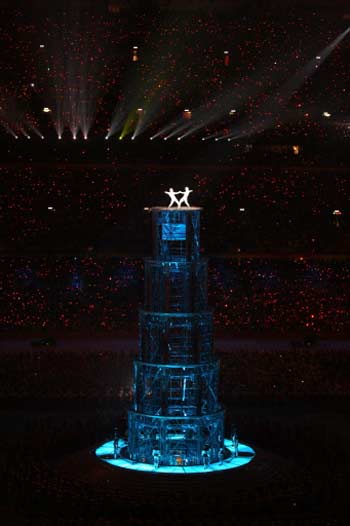 Dancers perform on a tower during the closing ceremony for the 2008 Beijing Olympic Games at the National Stadium also known as the "Bird's Nest" on August 24, 2008. [Agencies]