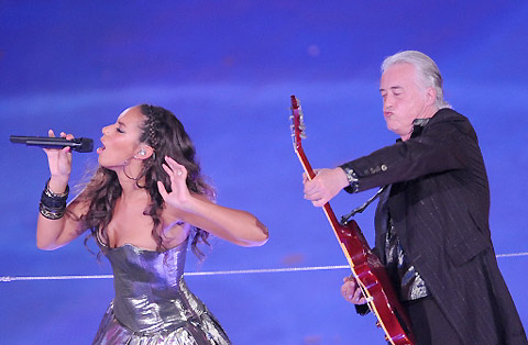 Led Zeppelin guitarist Jimmy Page (R) and British singer Leona Lewis perform during the closing ceremony for the 2008 Beijing Olympic Games at the National Stadium also know as the "Bird's Nest" on August 24, 2008. [Agencies]