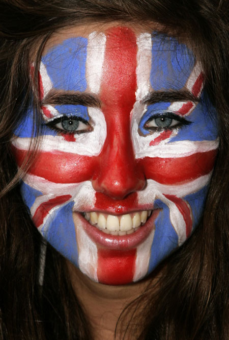 A woman with her face painted as the Union flag is seen during a screening of the official handover of the Beijing Olympic Games to London in front of Buckingham Palace in London August 24, 2008.[Agencies]
