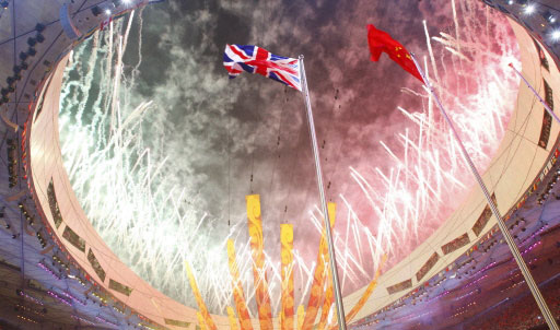 Fireworks light the sky over the Union Jack and Chinese flag during the closing and handover ceremony for the 2008 Beijing Olympic Games at the National Stadium also know as the "Bird's Nest" on August 24, 2008.[Agencies]