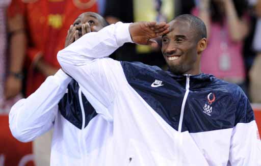 USA's Kobe Bryant celebrates on the podium after the men's basketball gold medal match of the Beijing 2008 Olympic Games on August 24, 2008 at the Olympic basketball Arena in Beijing. [Agencies]