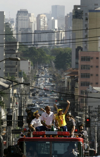 | Olympic long jump gold medalist Brazilian Maurren Higa Maggi (R), and her coach, Nelio Moura (C) wave to fans as they parade atop a fire truck upon their arrival from the Beijing Olympic Games, in Sao Paulo, Brazil, on August 26, 2008. Maggi became the first Brazilian female athlete to win an olympic gold medal in an individual competition. [Agencies] |