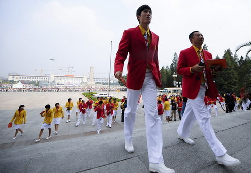 Liu Xiang(L), who withdrew with an injury from the 110 m hurdles heat, walks into the Great Hall of the People to attend a celebration hosted by the General Administration of Sport in Beijing on August 26, 2008. [Xinhua]