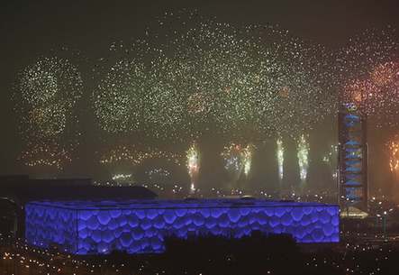 Fireworks explode over the National Aquatics Center, also known as the Water Cube, during a rehearsal for the opening ceremony of the 2008 Beijing Olympic Games at the Olympic Green in Beijing, July 16, 2008.[Agencies]
