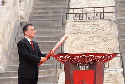 Premier Wen Jiabao lights the Beijing Paralympic flame at the ancient Temple of Heaven in Beijing on Thursday, kicking off the torch relay across China before the 13th Paralympics opens on September 6. [Xinhua]