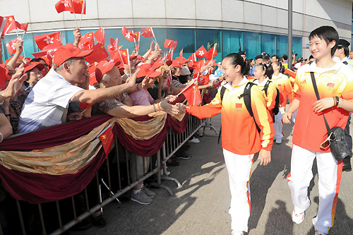 Beijing Olympic gymnastics gold medallist Cheng Fei (2nd R) shakes hands with local residents in Hong Kong Special Administrative Region, August 30, 2008. Sixty-three of China's Beijing Olympic champions visited the Hong Kong Special Administrative Region for a three-day tour. [Xinhua]