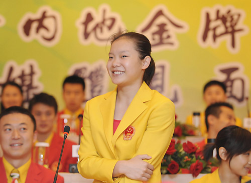 Beijing Olympic gymnastics gold medallist Cheng Fei (C) answers a question from the media during a press conference in Hong Kong, August 30, 2008. Sixty-three of China's Beijing Olympic champions visited the Hong Kong Special Administrative Region for a three-day tour. [Xinhua]