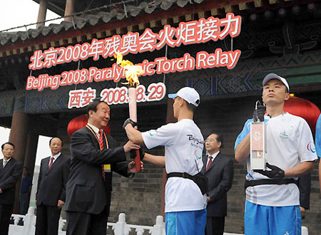 Jiang Xiaoyu (L), vice president of Beijing Organizing Committee for the Games of the XXIX Olympiad, takes the torch. The Paralympic torch relay kicked off in Xi'an, the capital city of Shaanxi Province on August 29, 2008. [Xinhua]