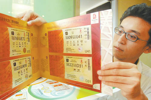 A member of the ticketing sales staff shows some Beijing Olympic commemorative tickets in Beijing, August 27, 2008. A set of 2008 Beijing Olympic Commemorative Tickets is to be issued on September 21 by China Banknote Printing and Minting. [Beijing Stardaily]