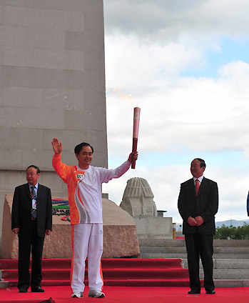 First torchbearer Yang Zhimin displays the Beijing Paralypic torch to the spectators in Hohhot, August 30, 2008. The Paralympic torch relay kicked off in Hohhot, Inner Mongolia Autonomous Region on Saturday. [Xinhua]
