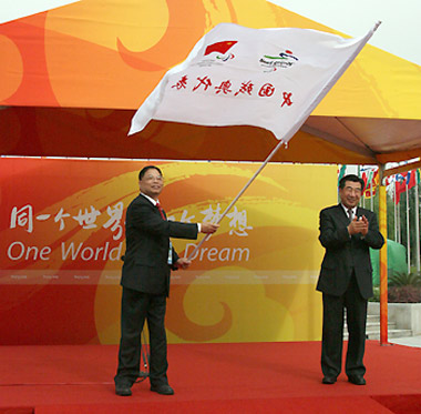 Chinese Vice Premier Hui Liangyu presents the flag of Chinese Paralympic delegation inside the Paralympic Village, in Beijing, August 30, 2008. The Beijing Paralympics village officially opened its doors on Saturday.[Xinhua]