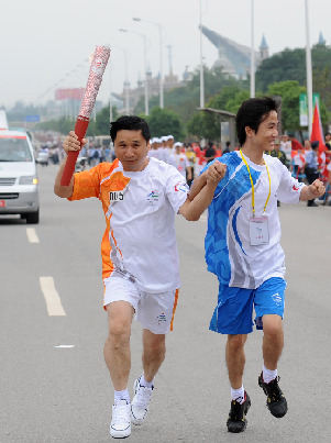 Zhu Gang (left), who is visually impaired, runs as a torchbearer with the help of a volunteer in Changsha, Hunan province August 31 2008. [Xinhua]