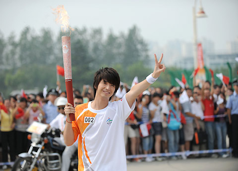 Song Xiaobo,a reality show singer, holds the torch. The Paralympic torch relay started its tour in Shanghai on September 1, 2008. [Xinhua]