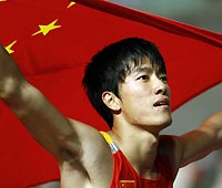 Liu Xiang receives interview after winning men's 110-meter hurdles in Osaka. The fifth-placed Shi Dongpeng also scored his personal best in 13.19 seconds. |