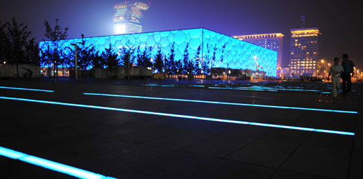 Night scenes from the Olympic central district looked quite romantic under the Olympic flame burning from the Bird’s Nest.