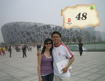 Cousins from the Liu family but of different countries meet in front of the Bird's Nest, the National Stadium, reflecting the harmony of One world, One Dream.