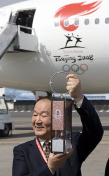 Jiang Xiaoyu, the vice president of the 2008 Olympics organising committee, holds the Olympic flame upon its arrival at Almaty airport April 1, 2008. [Agencies]