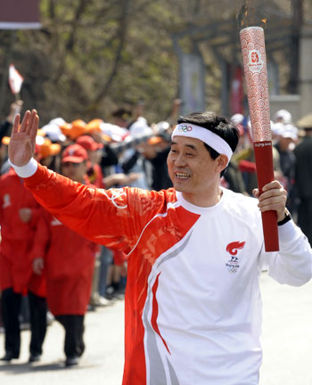 Chinese Bo Juliang (front), holding Beijing Olympic torch, waves to spectors during the torch relay in Almaty, Kazakhstan, April 2, 2008. Almaty is the first stop of the global relay which will also cover 21 cities outside Chinese mainland from April 1 to May 3. [Xinhua]