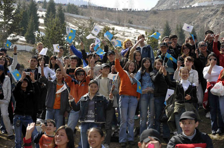 Local residents wave flags to welcome the arrival of Beijing Olympic torch touring Almaty, Kazakhstan, April 2, 2008. Almaty is the first stop of the global relay which will also cover 21 cities outside Chinese mainland from April 1 to May 3. [Xinhua]