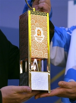 Jiang Xiaoyu (L) executive vice president of the Beijing Organizing Committee of Olympic Game, and an handler (R) holds the Olympic flame, shortly after arriving at San Francisco International airport, April 8, 2008. [Agencies]
