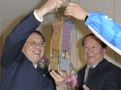 Chinese ambassador to US Zhou Wenchong (L) holds the lantern encasing Beijing Olympic Flame in San Francisco, April 8, 2008. [Xinhua]