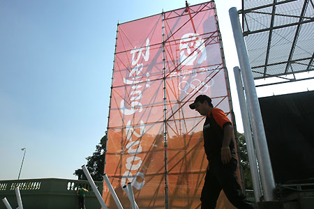 A worker walks past a billboard for the Olympic torch relay in Buenos Aires, capital of Argentina on April 11, 2008. The Beijing Olympic torch run in Buenos Aires is due to begin on Friday after the San Francisco relay ended smoothly on Thursday despite route changes made to ensure the dignity of the Olympic flame and the safety of torchbearers. [Xinhua]
