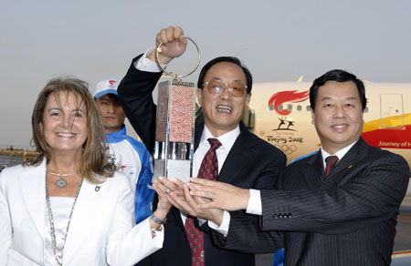 Executive vice president of the Beijing Organizing Committee for the Games Liu Jingmin (2nd R), Chinese ambassador to Argentina Zeng Gang (R) and Argentine Olympic Committee (COA) vice president Alicia Masoni de Morea hold the Olympic flame lamp at Ezeiza International Airport in Buenos Aires, capital of Argentina, at 17:00 local time (20:00 GMT) April 10, 2008. The Beijing Olympic torch run in Buenos Aires is due to begin on Friday after the San Francisco relay ended smoothly on Thursday despite route changes made to ensure the dignity of the Olympic flame and the safety of torchbearers. [Xinhua] |