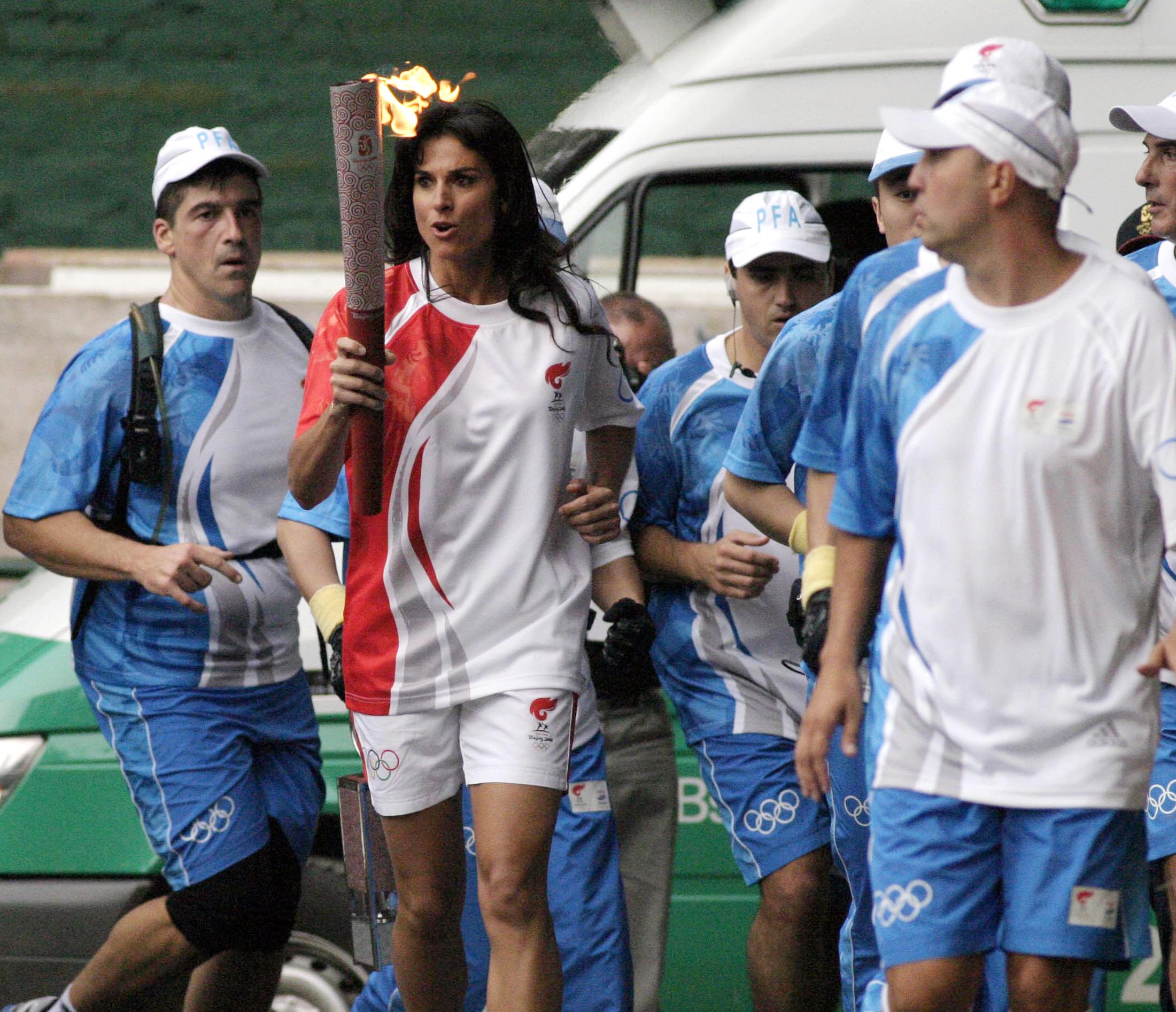 Former tennis player Gabriela Sabatini of Argentina carries the Olympic torch at the last stage of the Olympic relay in Buenos Aires April 11, 2008.[Agencies]
