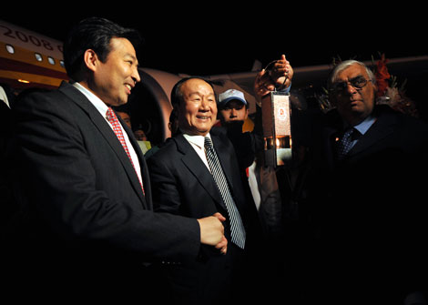 Executive vice president of the Beijing Organizing Committee of the Games Jiang Xiaoyu (C) receives a warm welcome from Arif Hassan, President of Pakistan Olympic (R) as the Olympic flame arrives in Islamabad, Pakistan, April 16, 2008. [Xinhua]