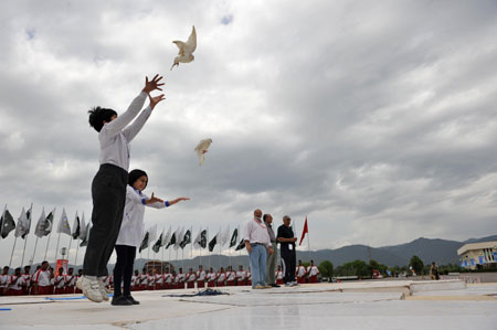 Two pupils releases doves during a dress rehearsal for the opening ceremony for the torch relay, in Islamabad, Pakistan, April 15, 2008. The Islamabad leg of the Beijing Olympic torch relay is due to begin on Wednesday. [Xinhua]