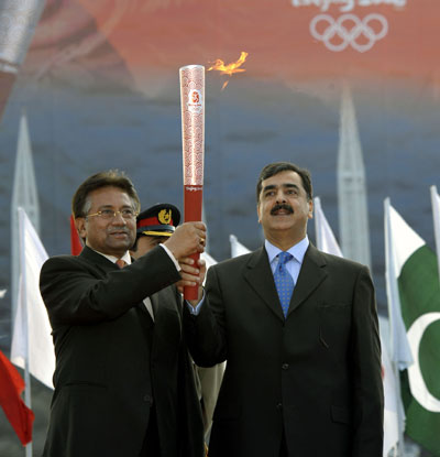 Pakistan President Pervez Musharraf (L) and Prime Minister Yousaf Raza Gillani hold the Olympic torch during an opening ceremony for Beijing Olymic torch relay in Islamabad, April 16, 2008. [Xinhua]
