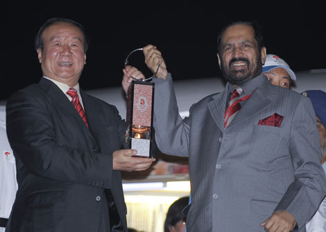 President of India Olympic Committee Kalmandi (R) and Jiang Xiaoyu, executive vice president of the Beijing Organizing Committee for the Games, hold the lantern encasing the Olympic flame in New Delhi, India, April 17. The torch relay in New Delhi is due to begin on Thursday. [Xinhua]